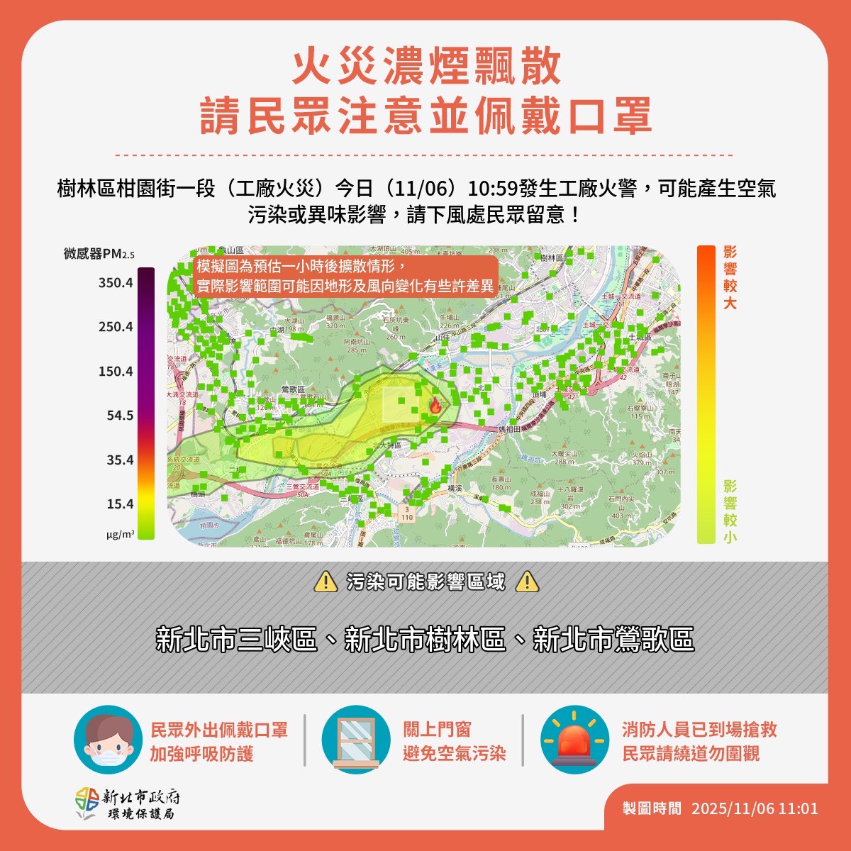 【空品通報】新北市樹林區柑園街一段今日(11/06)10:59發生 #火警,經模式模擬煙霧及部分異味可能往下風處飄散,預估影響範圍包括 #三峽區#樹林區#鶯歌區。提醒鄰近居民緊閉門窗、外出記得配戴口罩,避免發生身體不適、保護呼吸道健康!